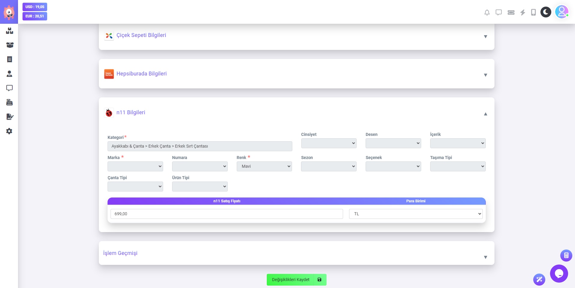 Fiyat güncelleme işlemi gerçekleştirebilmek için "n11 Bilgileri" başlığının altında bulunan "n11 Satış Fiyatı" kısmını değiştirmeniz ve sayfanın en alt kısmında bulunan "Değişiklikleri Kaydet" butonuna basmanız yeterlidir.