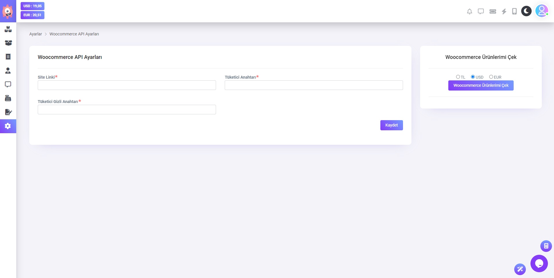 Dilerseniz "Woocommerce Ürünlerimi Çek" butonunun hemen üstünde bulunan TL - USD - EUR seçeneklerinden kur endeksli ürün bilgisi çekebilirsiniz. (Woocommerce üzerinde TL olarak gözükür. Sistemde USD/EUR olarak gözükür ve sürekli olarak güncel USD/EUR kurundan otomatik olarak güncellenir)