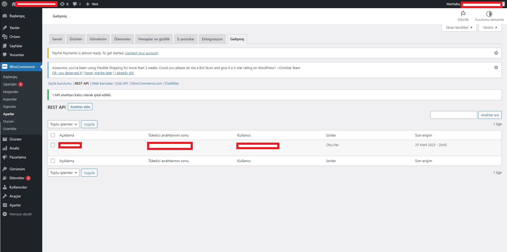 Woocommerce API bilgilerinize websitenizin admin panelinde bulunan sol taraftaki menüden "WooCommerce" "Ayarlar" "Gelişmiş" "REST API" kısmından ulaşabilirsiniz.